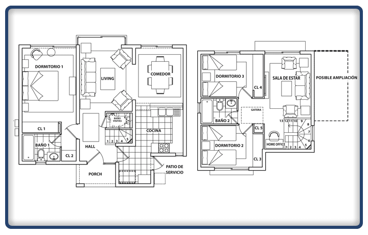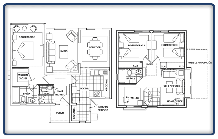 Hall de acceso y distribución con piso porcelanato rústico. Estacionamientos para 2 vehículos. Porch de acceso cubierto.Living comedor piso fotolaminado. Opcional cocina cerrada.